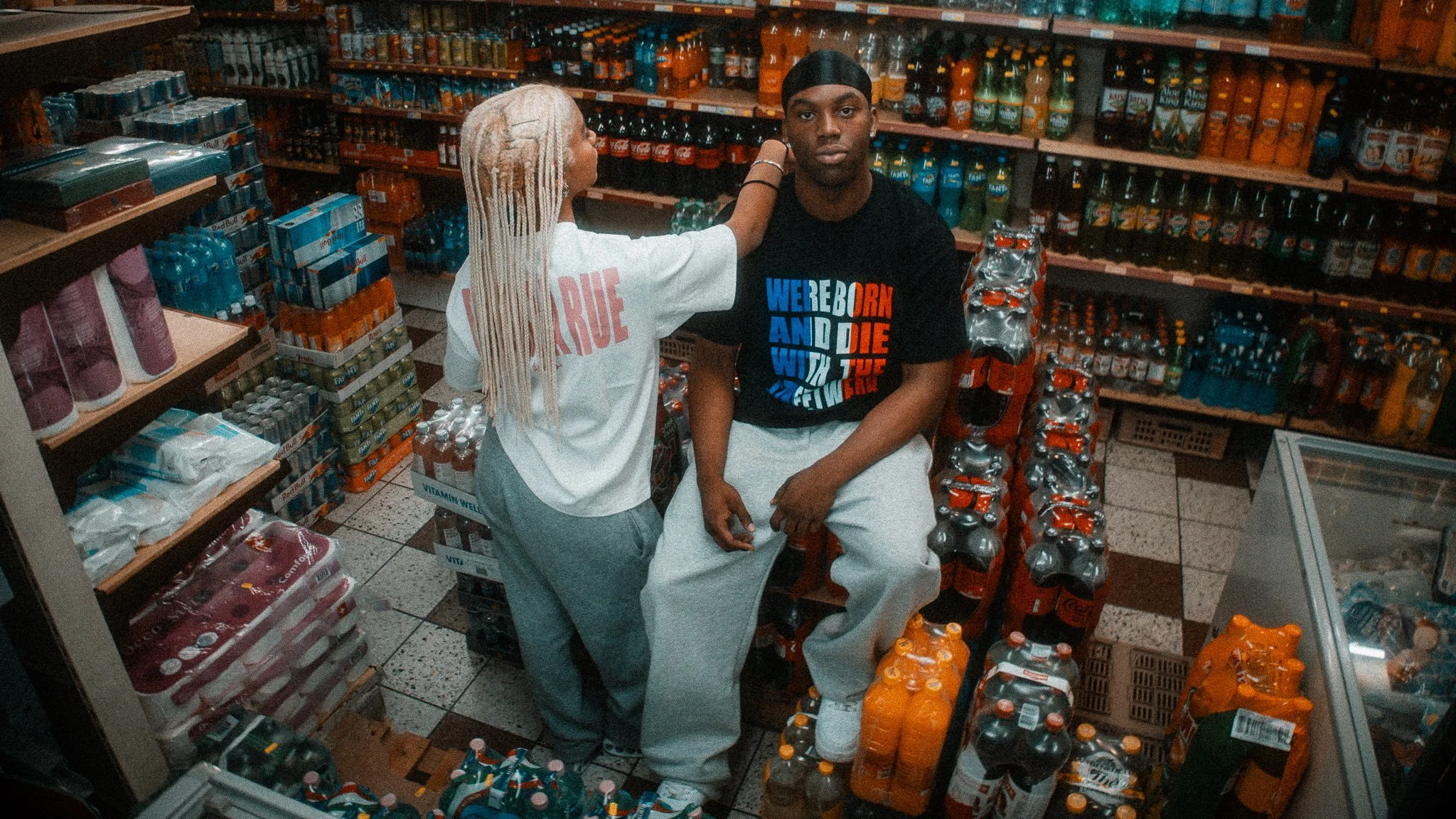 Two young individuals in a grocery store aisle with shelves stocked with orange and black bottles and cans. One sitting cross-legged in front, wearing a black T-shirt with bold text, and a black headscarf. The other standing behind, wearing a cap and