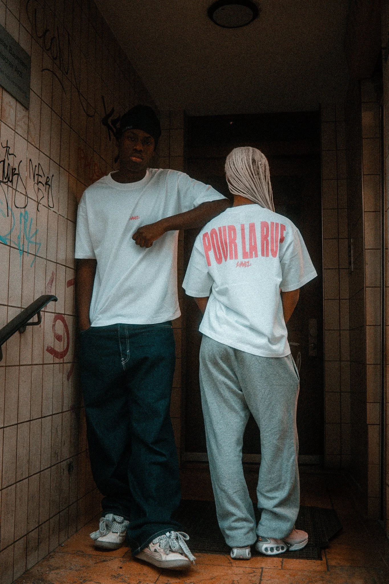 Two people stand in an urban or subway setting with tiled walls and graffiti. One person is facing the camera, wearing a black beanie, white T-shirt, and baggy jeans. The other has their back to the camera, with braided hair, a white T-shirt with pin View fullsize