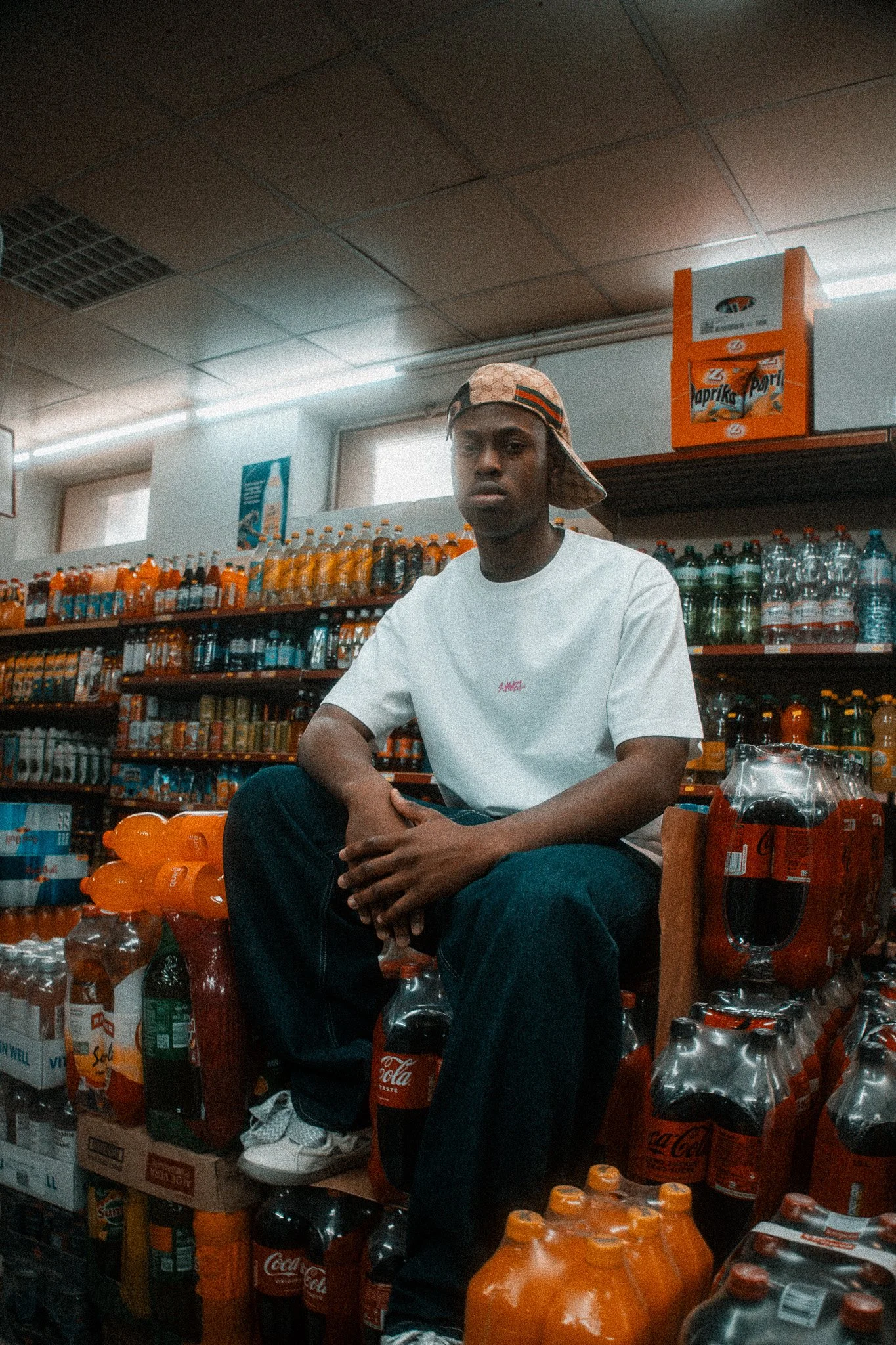 Young man sitting on bottles of soda and water in convenience store aisle, wearing white t-shirt and patterned cap. View fullsize